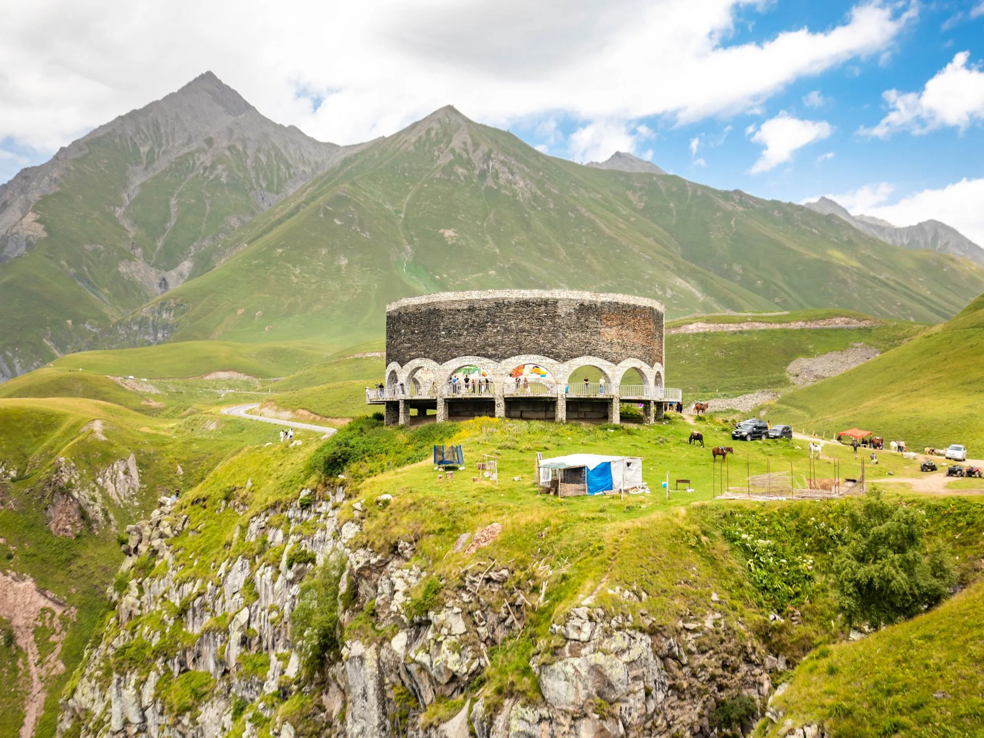 Leave Tbilisi behind and travel north along the Georgian Military Highway, where rolling hills give way to soaring peaks. Stop at the monumental Chronicles of Georgia, a powerful tribute to kings and saints, offering stunning views over the Tbilisi Sea.
