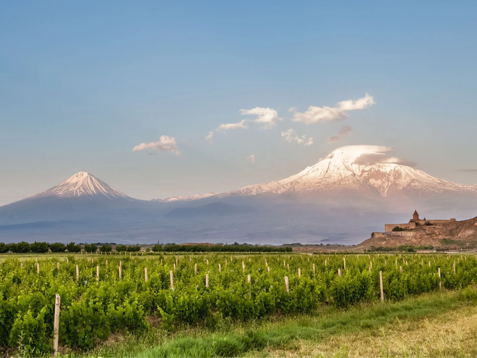 Later, journey south across the vast Armenian plains, where the snow-capped silhouette of Mount Ararat rises ahead, steeped in legend and longing. At its foot lies the Khor Virap Monastery, where Saint Gregory the Illuminator was once imprisoned. The view from the hilltop - encompassing the monastery, surrounding fields, and Mount Ararat in the distance - is one of the most iconic in Armenia.